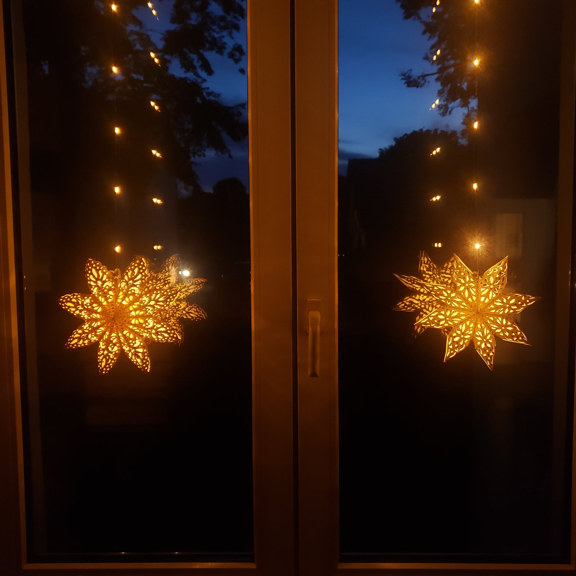 Der Stern (20 cm) eignet sich besonders für kleine Fenster. Die Beleuchtung besteht aus 20 warmweißen LEDs. Die Zuleitung beträgt 3 Meter und hat einen USB Anschluss. Der Betrieb ist sowohl über eine Steckdose (mit Ihrem Handyaufladegerät) als auch über eine Powerbank möglich (erhältlich z.B. im Kaufland).