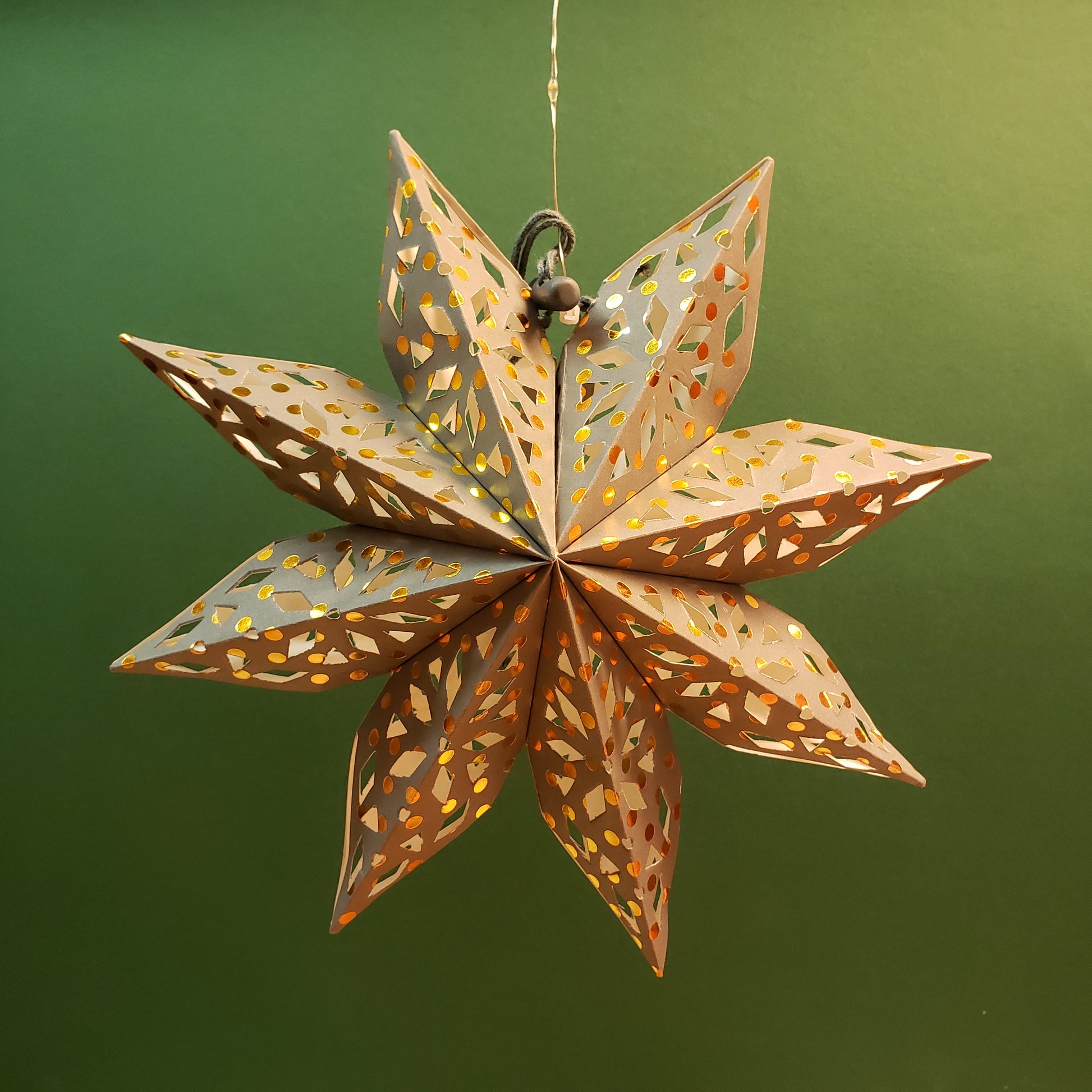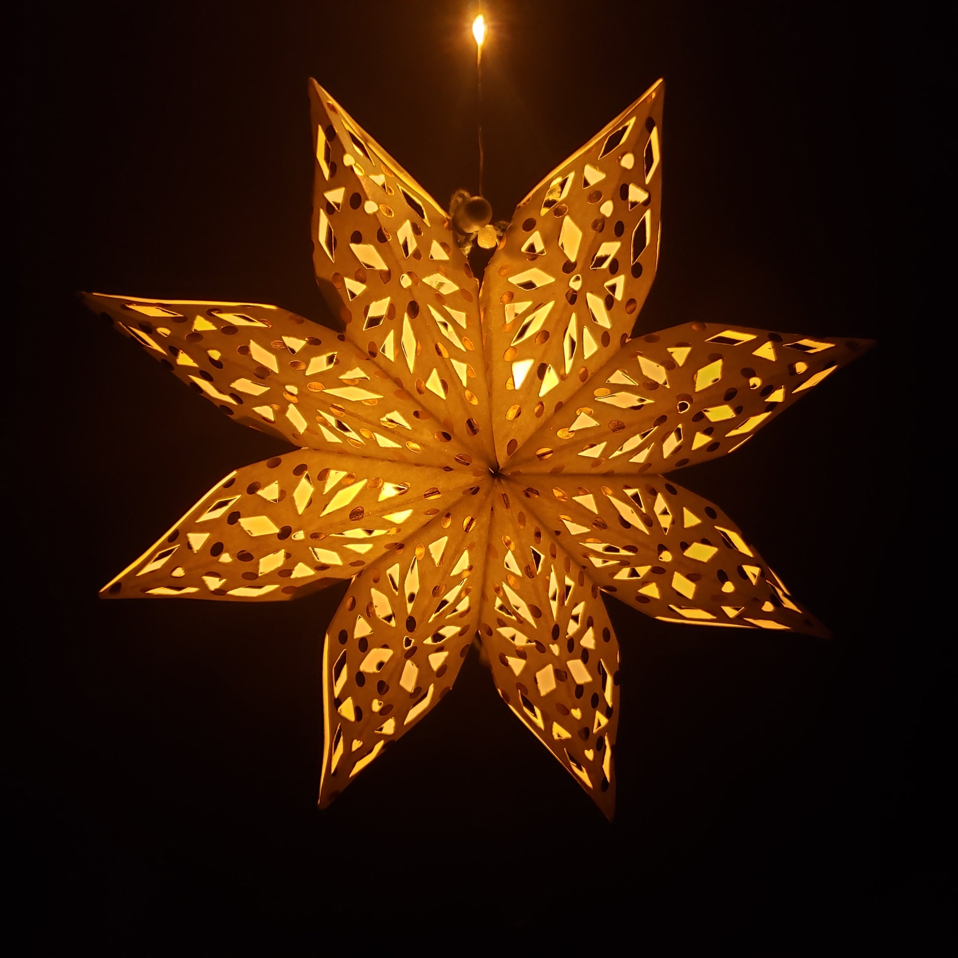 Der Stern (20 cm) eignet sich besonders für kleine Fenster. Die Beleuchtung besteht aus 20 warmweißen LEDs. Die Zuleitung beträgt 3 Meter und hat einen USB Anschluss. Der Betrieb ist sowohl über eine Steckdose (mit Ihrem Handyaufladegerät) als auch über eine Powerbank möglich (erhältlich z.B. im Kaufland).
